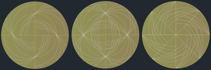 - A la derecha un conjunto de paralelos tanto del sistema ecuatorial (paralelos de declinación) como almucantares de un sistema auxiliar horizontal de latitud 90º.